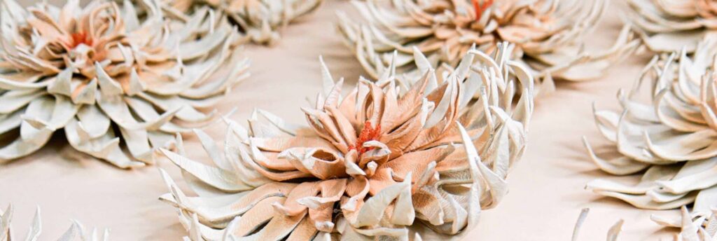 Unsere erlesenen Lederblumen sind kleine Kunstwerke, die ausschließlich in reiner Handarbeit entstehen können. Qualifizierte Kunsthandwerkerinnen aus verschiedenen europäischen Ländern kreieren für uns diese zarten Skulpturen – jedes Exemplar trägt eine ganz persönliche Handschrift. Für die Herstellung verwenden wir feinstes, weiches Leder, das nach sorgfältiger Modellierung seine endgültige Form erhält und dauerhaft gehärtet wird.